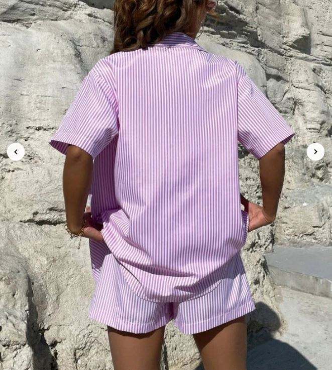 I-0607 Women's Fashion Cross-Border Casual Two-Piece Set American Style Lapel Striped Short Sleeve Knee Knitting Shirt Set