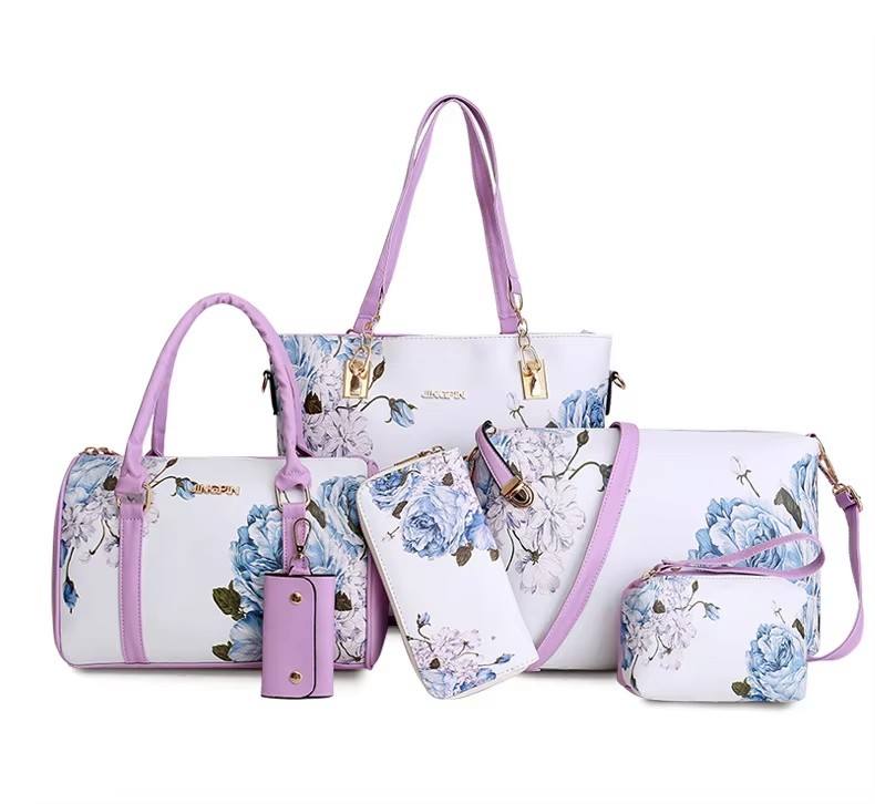 I-0925 Women Handbags Floral Print PU Leather Composite Bag Clutch Set Large Shoulder Bag Purse Female 6 Piece Set