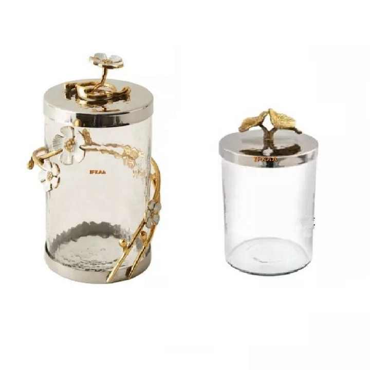 IFKAA 2-Pcs Set Bud Flower Glass Canisters Latest Decorative Design for Kitchen Use Cover Condiments Container Styles Spice Jar
