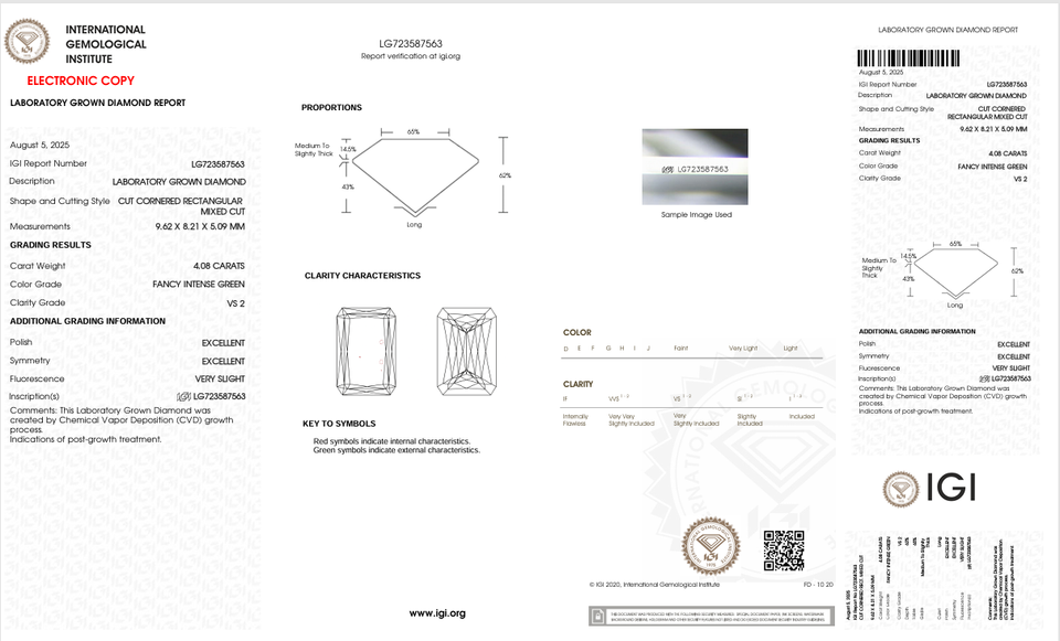 IGI Certified 4.08 CT Radiant Cut VS1 Lab Grown Diamond Fancy Intense Green Couleur Excellent Clarity Laser Drilled