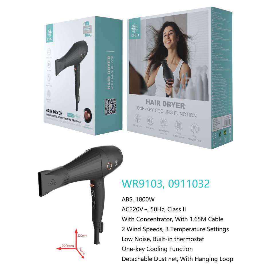 IKREA WR9103 Professional Hair Dryer with 2 Speeds/3 Temperatures 1.65M 1800W Black-Custom Logo