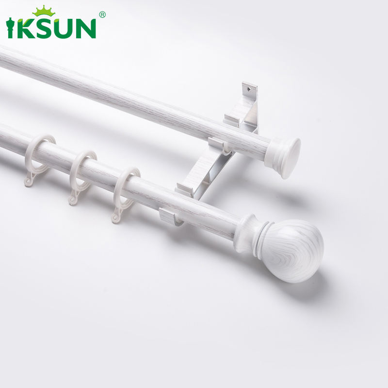 IKSUN 28mm Luxury Decorative Living Room Wall Mount Wood Grain Aluminium Double Curtain Rod Set With Finials Bracket
