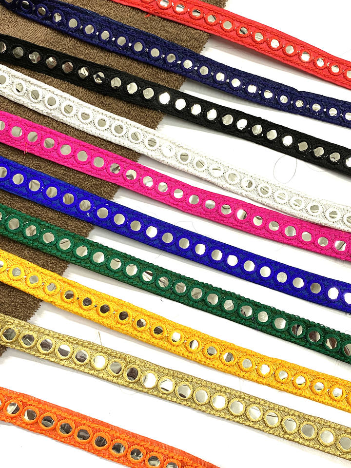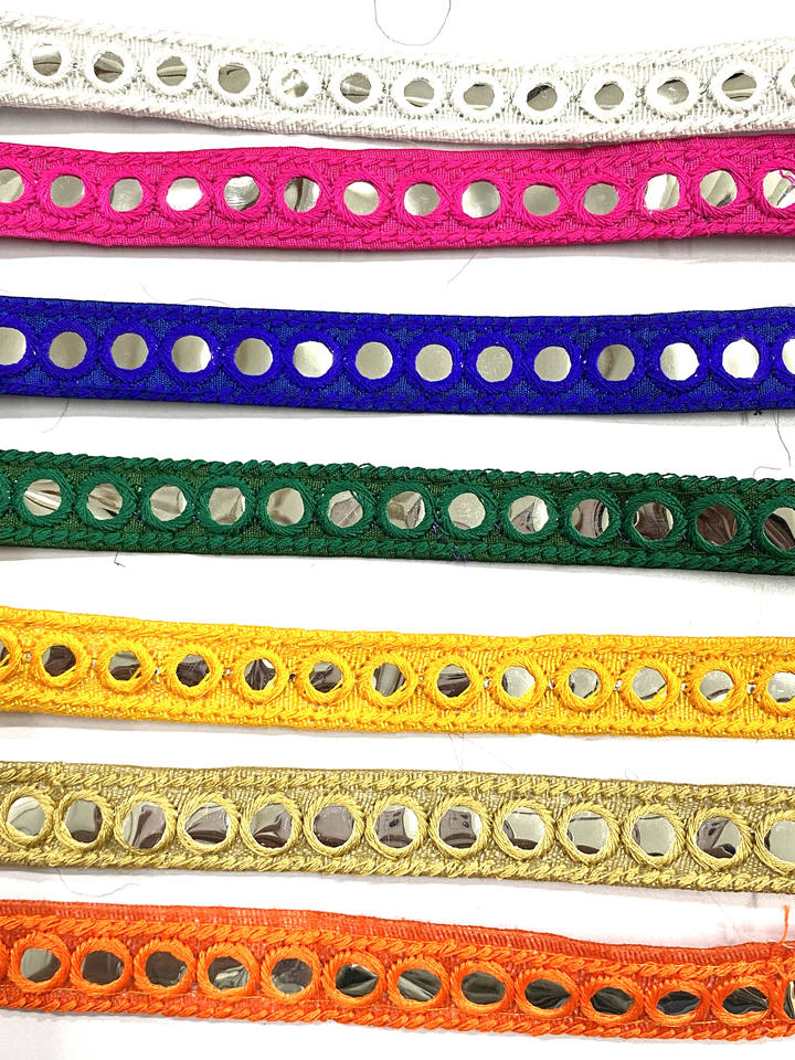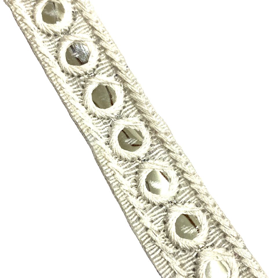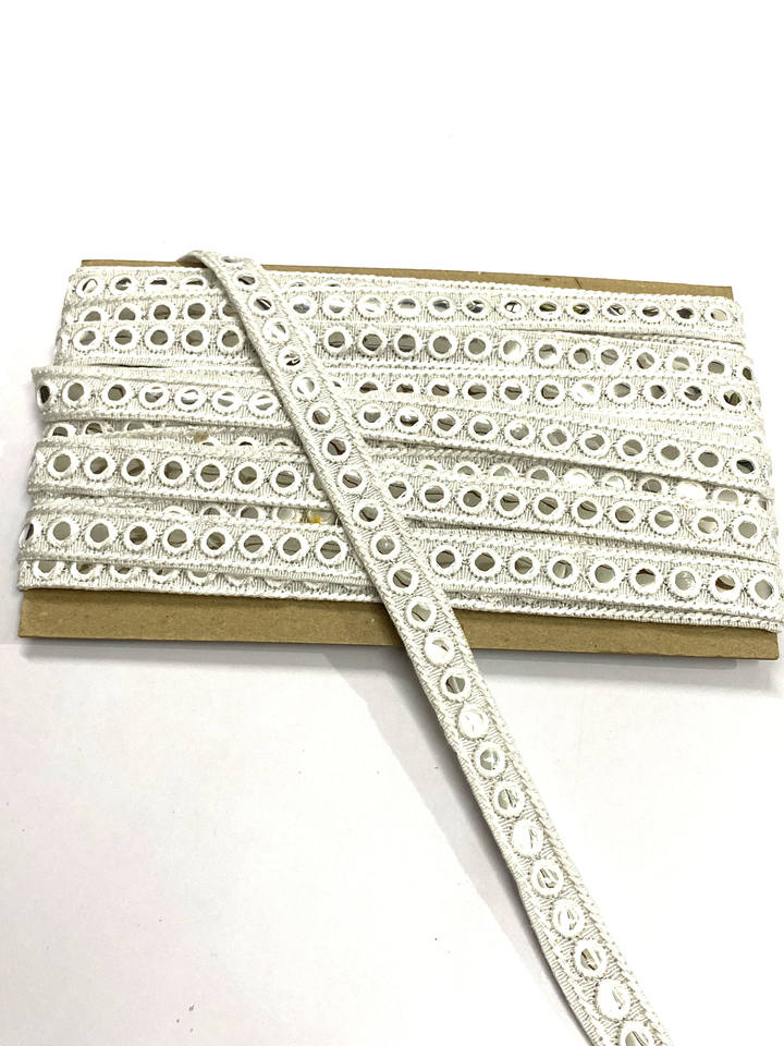INDIAN WHITE ETHNIC EMBROIDERY MIRROR SEQUINS THREAD LACE TRIMMING 25MM USED in WOMEN'S Footwear Deals in Wholesale