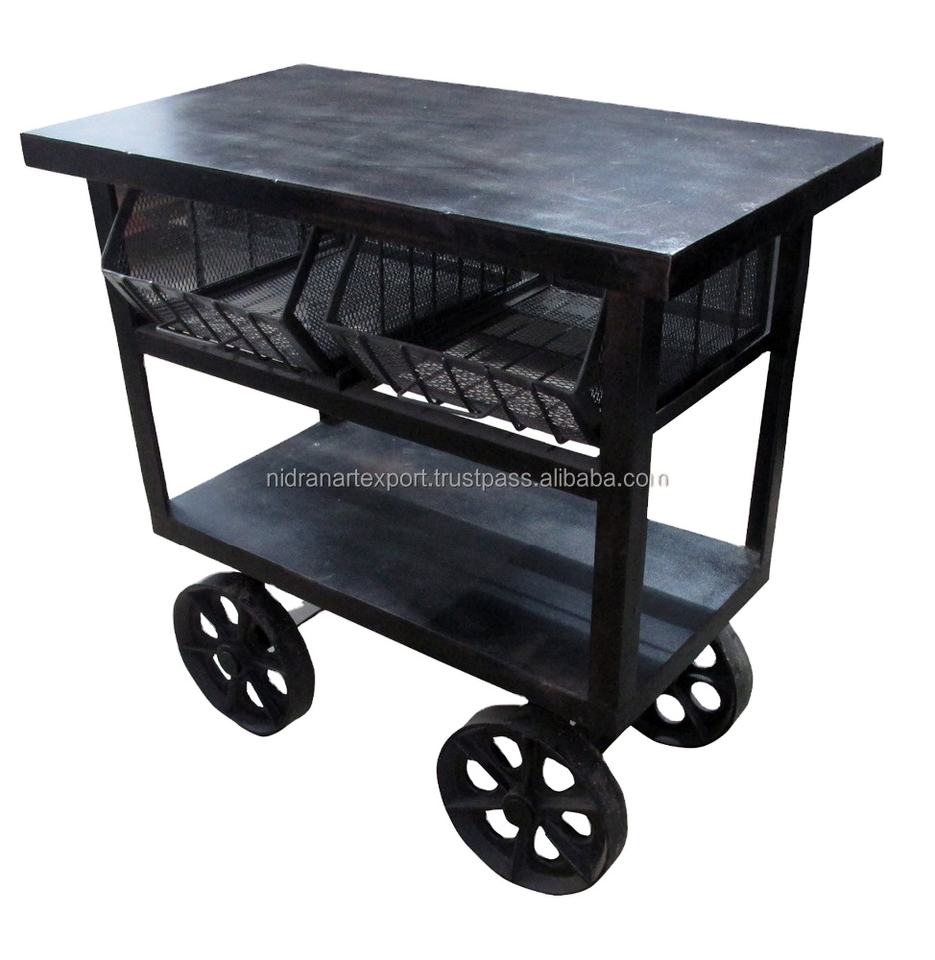 INDUSTRIAL & VINTAGE COMMERCIAL FURNITURE IRON METAL TROLLY TABLE WITH 2 DRAWERS & WHEELS