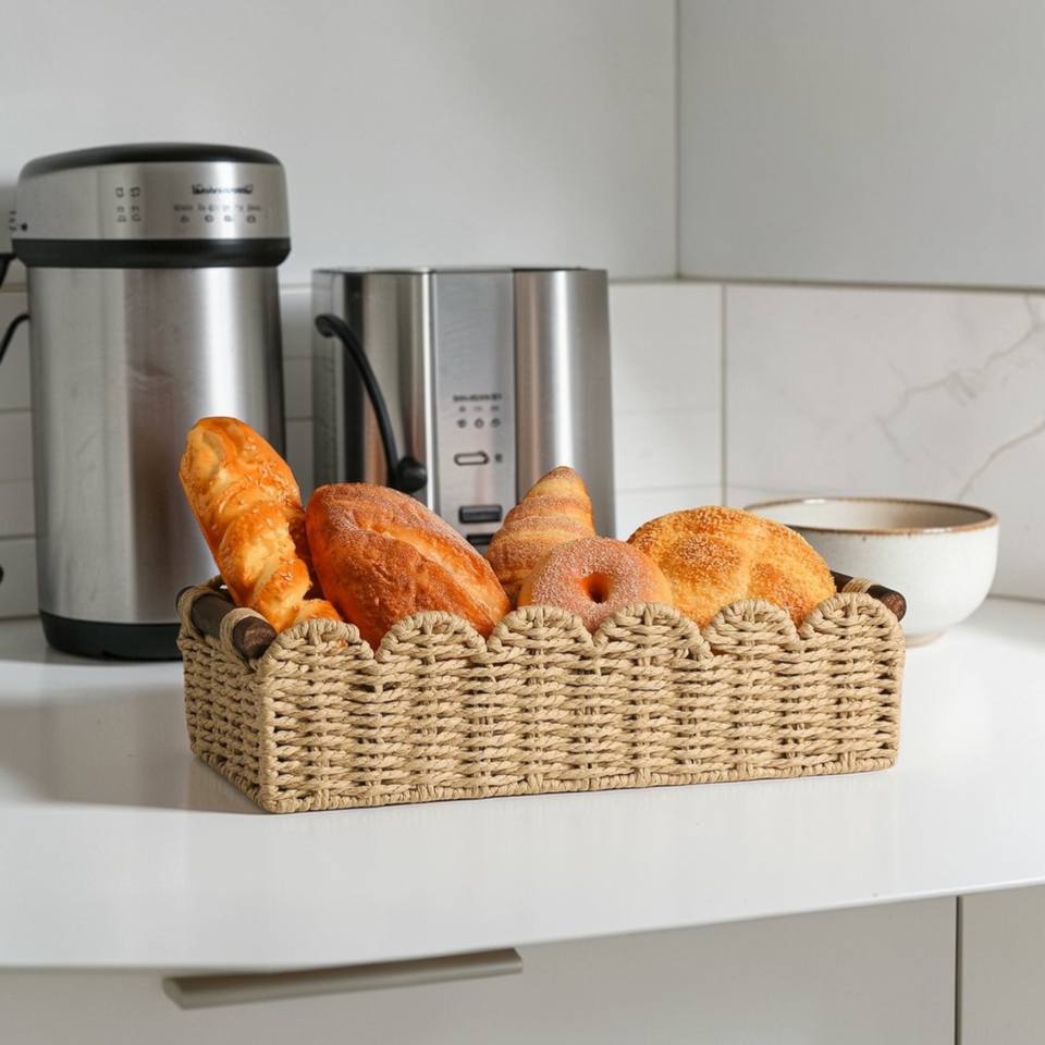 ISLA Handwoven Paper Rope Scalloped Tank Basket with Wooden Handles Wicker Organizer Bin for Bathroom Bedroom Kitchen Wholesale