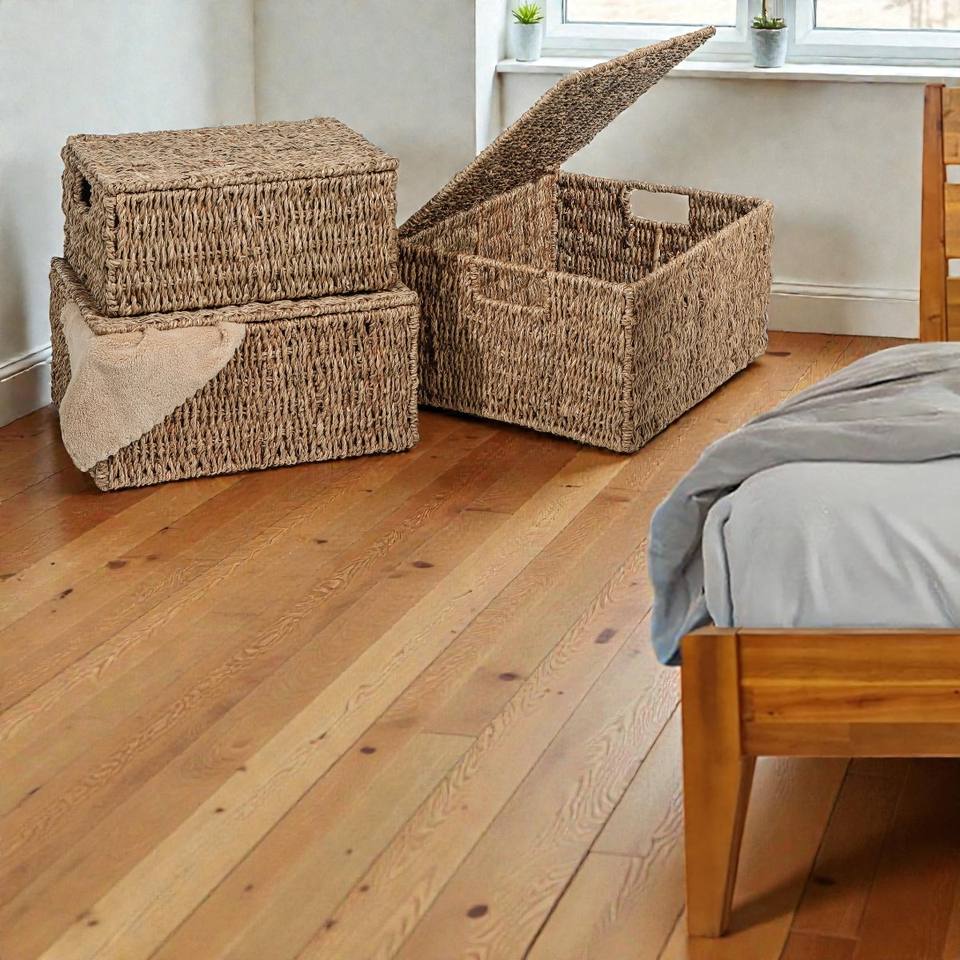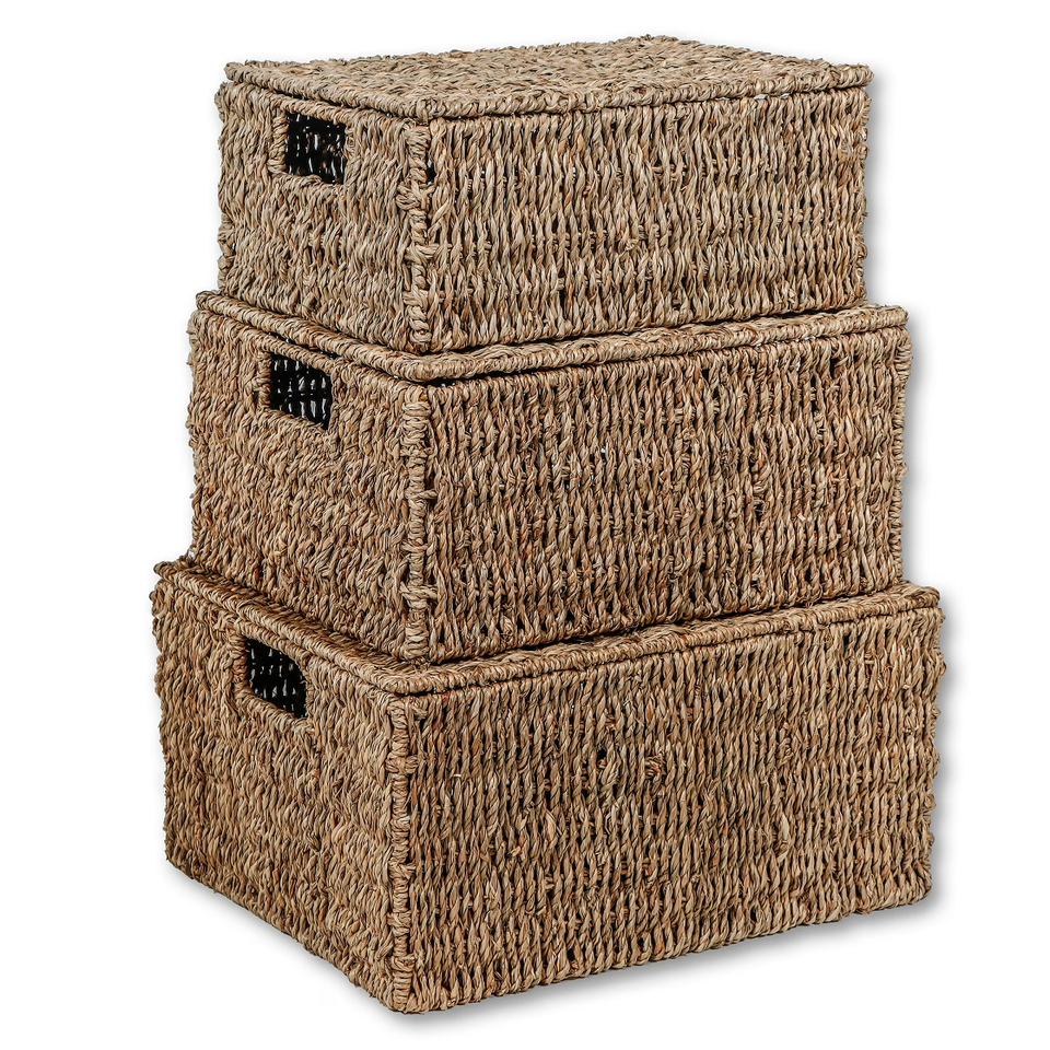 ISLA Set of 3 Nestable Handwoven Seagrass Rectangular Lidded Storage Basket Boxes for Shelf Closet & Home Organization Wholesale