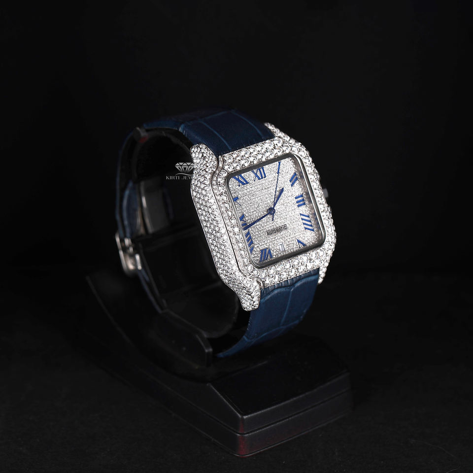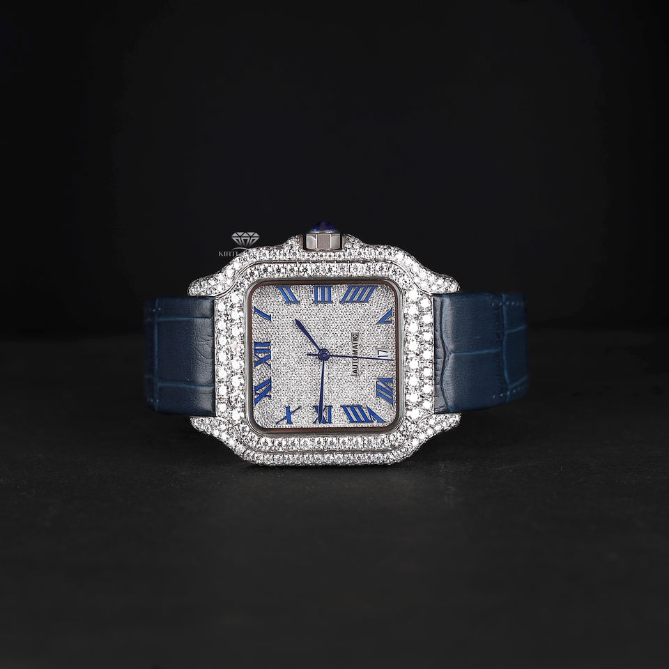 Ice Blue Statement Moissanite Diamond Watch Iced Out Square Roman Dial Luxury Hip Hop Blue Strap Autoamtic Men WristWatch