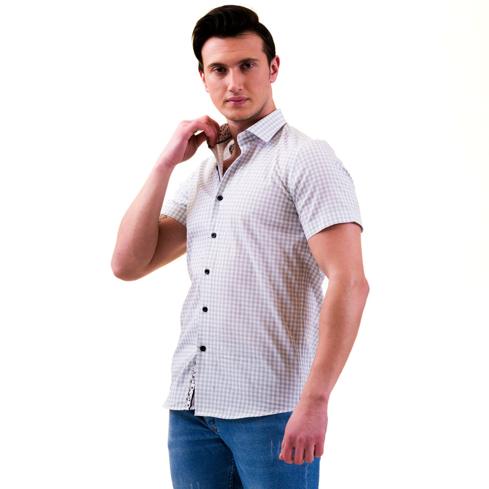Ice Blue and White Checkered Gingham Inside Placket Contrast Designer Summer Vacation Short Sleeves Men's Shirt