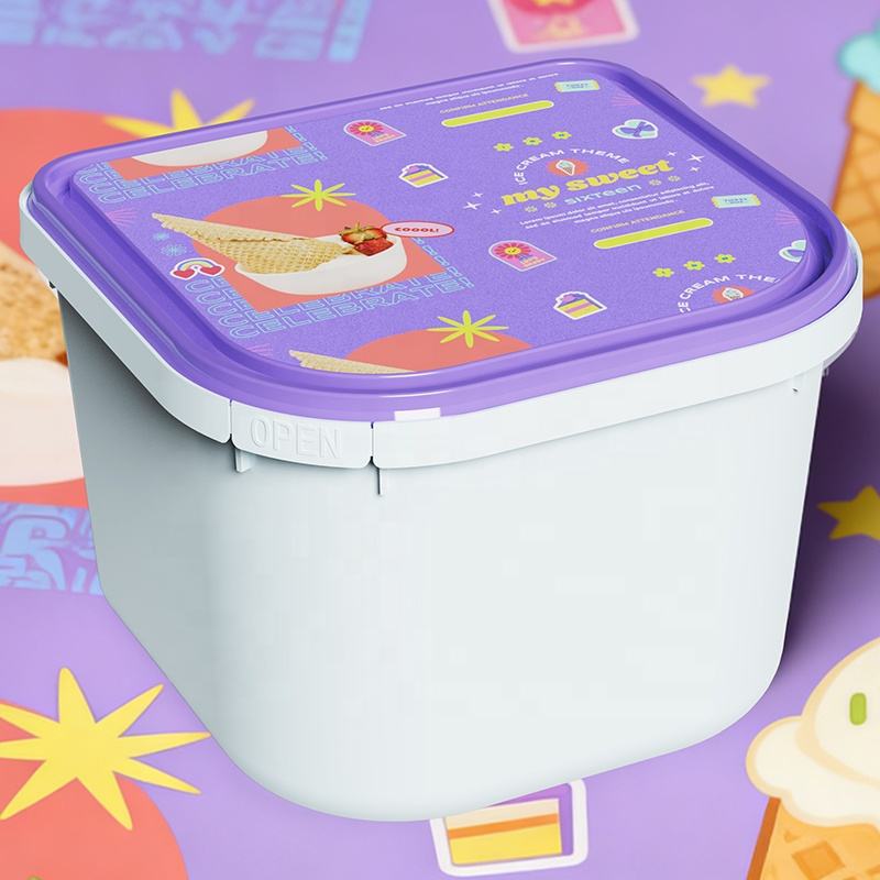 Ice Cream Tubs Plastic empty Containers for Gelato 2Ltr 1.8 Quart with Lids and security lock IML on top half cut shape