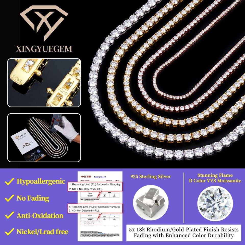Iced Hip Hop 2mm 3mm 4mm 5mm 6mm Moissanite Gold Plated 925 Sterling Silver Tennis Chain Necklace Bracelet Women GRA Certified