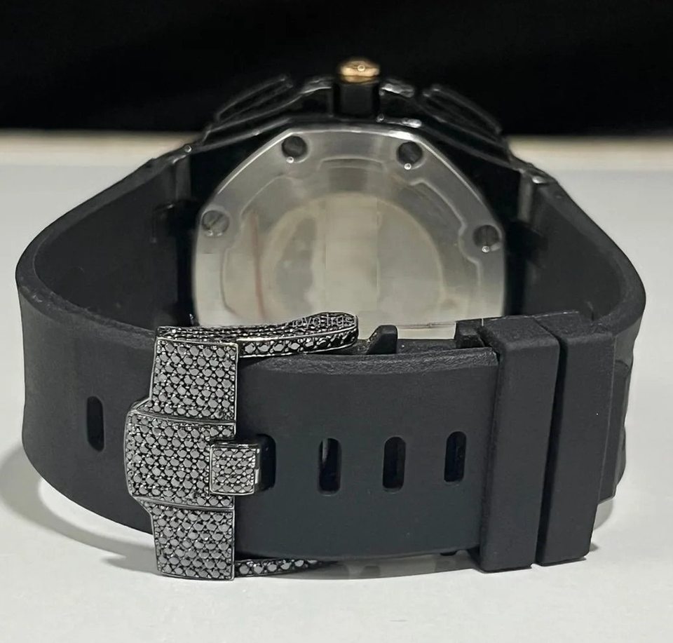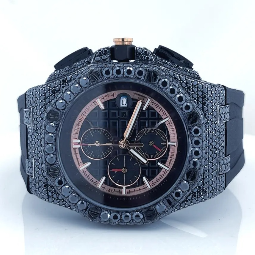Iced Black Moissanite Chronograph Hip Hop Unisex Stainless Steel Analog Wrist Watch Luxury Bling Street Style