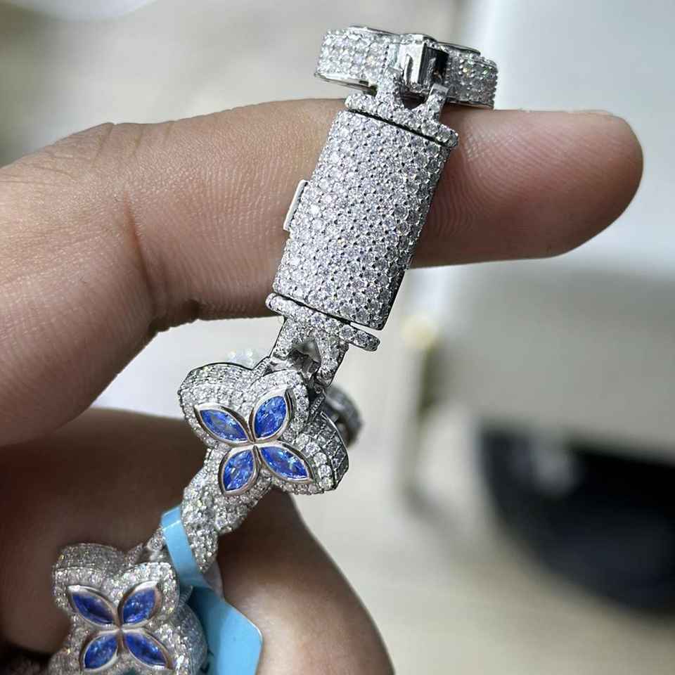 Iced Out Clover VVS Moissanite Sterling Silver Gold Plated Cuban Link Bracelet with Claw Setting for Men Women