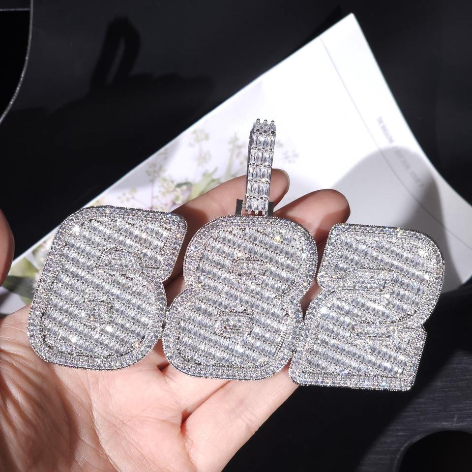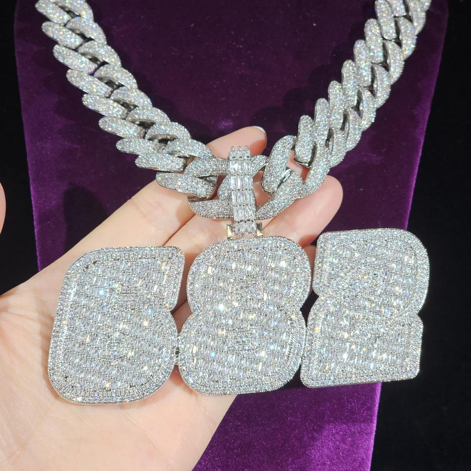 Iced Out Custom Name Necklace With 20mm Diamond Cuban Link Chain, Baguette Letter & Numbers Pendant, Hip Hop Jewelry