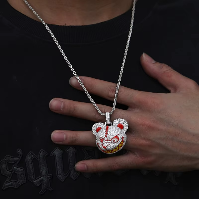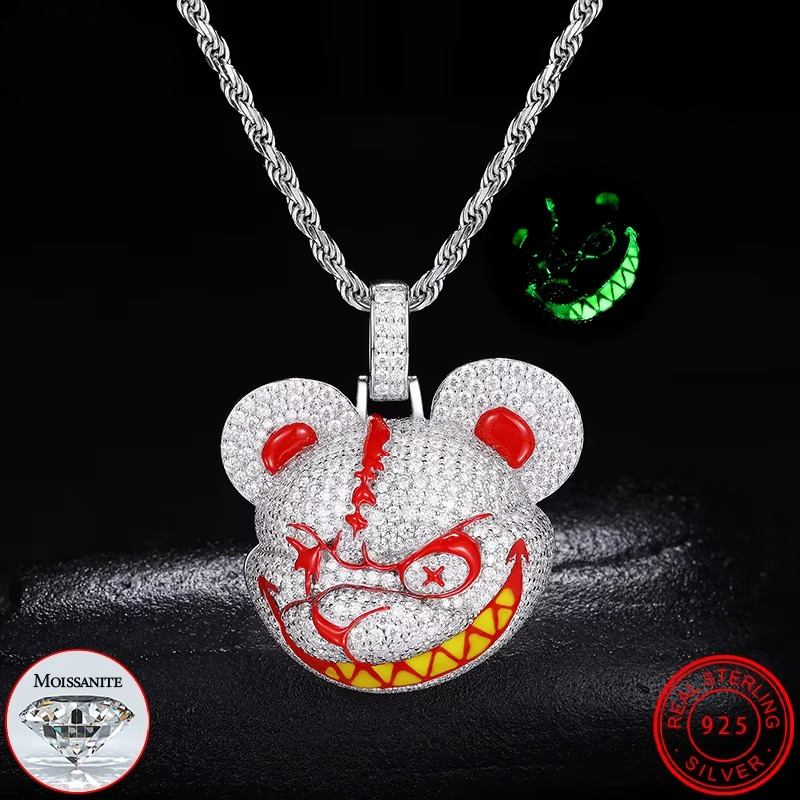 Iced-Out Evil Bear Moissanite Pendant Necklace Glow in the Dark Red & Yellow Design in 925 Sterling Silver with Rope Chain
