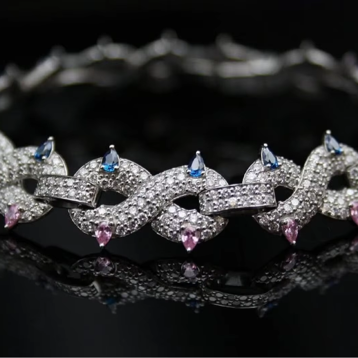 Iced Out Infinity Link Bracelet With Blue And Pink Stone Accents Diamond Look Luxury Hip Hop Wrist Jewelry