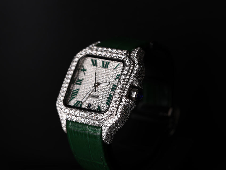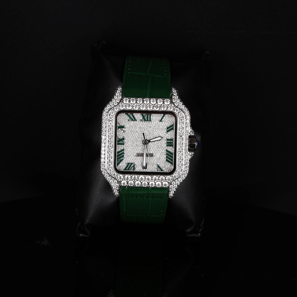Keywords:Green Leather Strap Square Dial Moissanite Diamond Watch