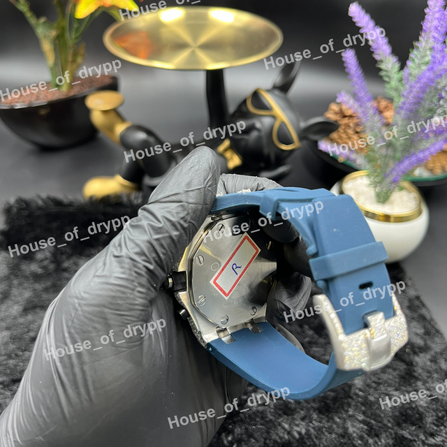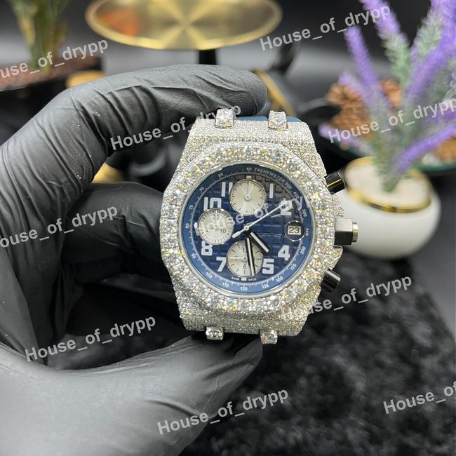 Iced Out Moissanite Diamond Chronograph Watch Blue Dial Luxury Sport Glass Crystal Stainless Steel Quartz Analog Unisex Watch
