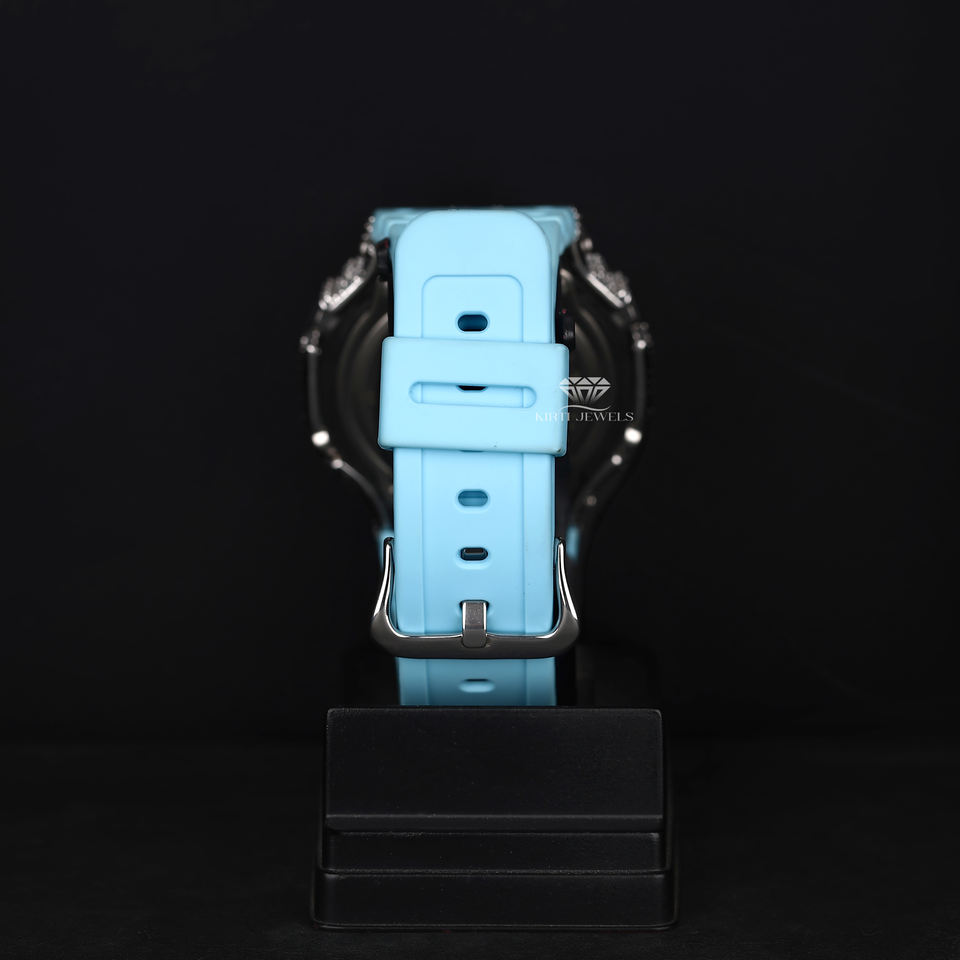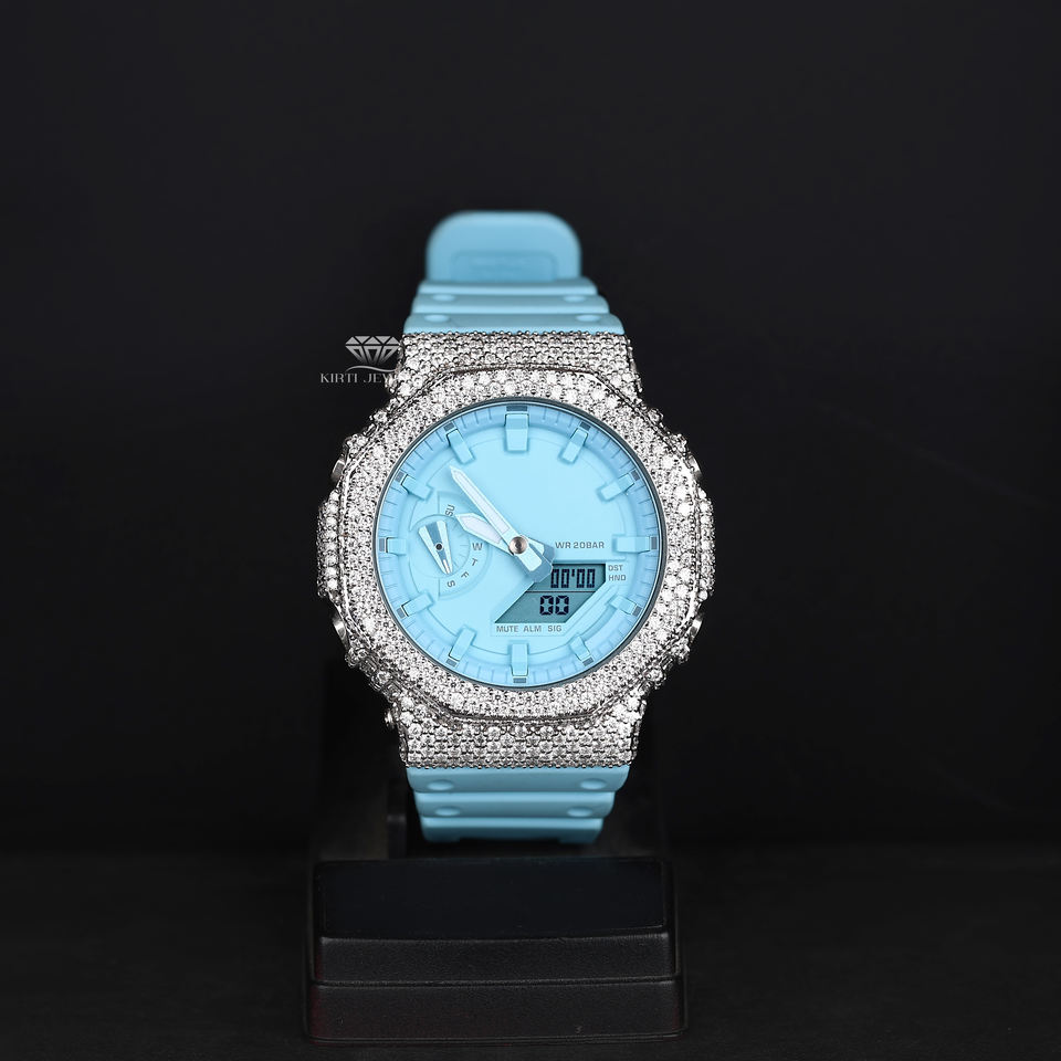 Sky Blue Dial Iced Out Analog Digital Watch