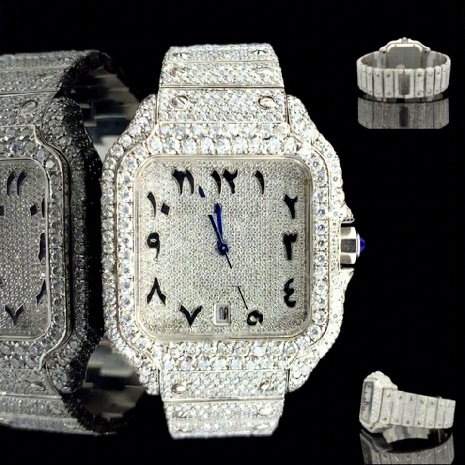 Iced Moissanite Diamond Watch Square Case Glass Dial Hip Hop Luxury Stainless Steel Band 10 Bar Water Resistant Bracelet Clasp