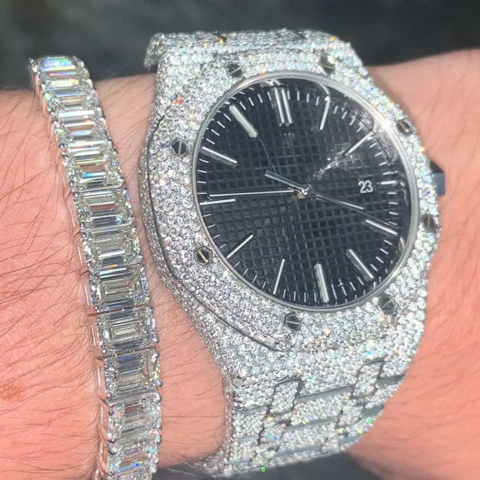 Iced Out Moissanite Luxury Quartz Watch for Men VVS Look Bling Style Stainless Steel Leather Strap Analog Dial
