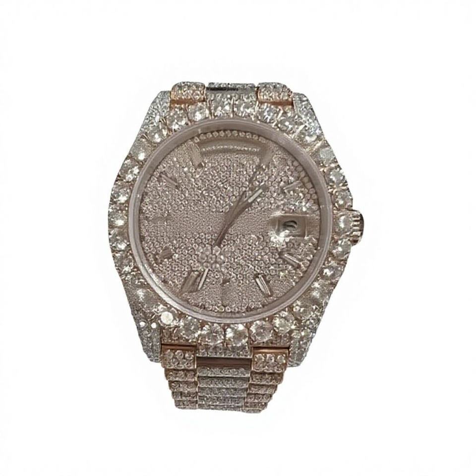 Iced Out Round Moissanite Watch with Glass Dial and Stainless Steel Bracelet Clasp Hip Hop Style 10 Bar Water Resistant