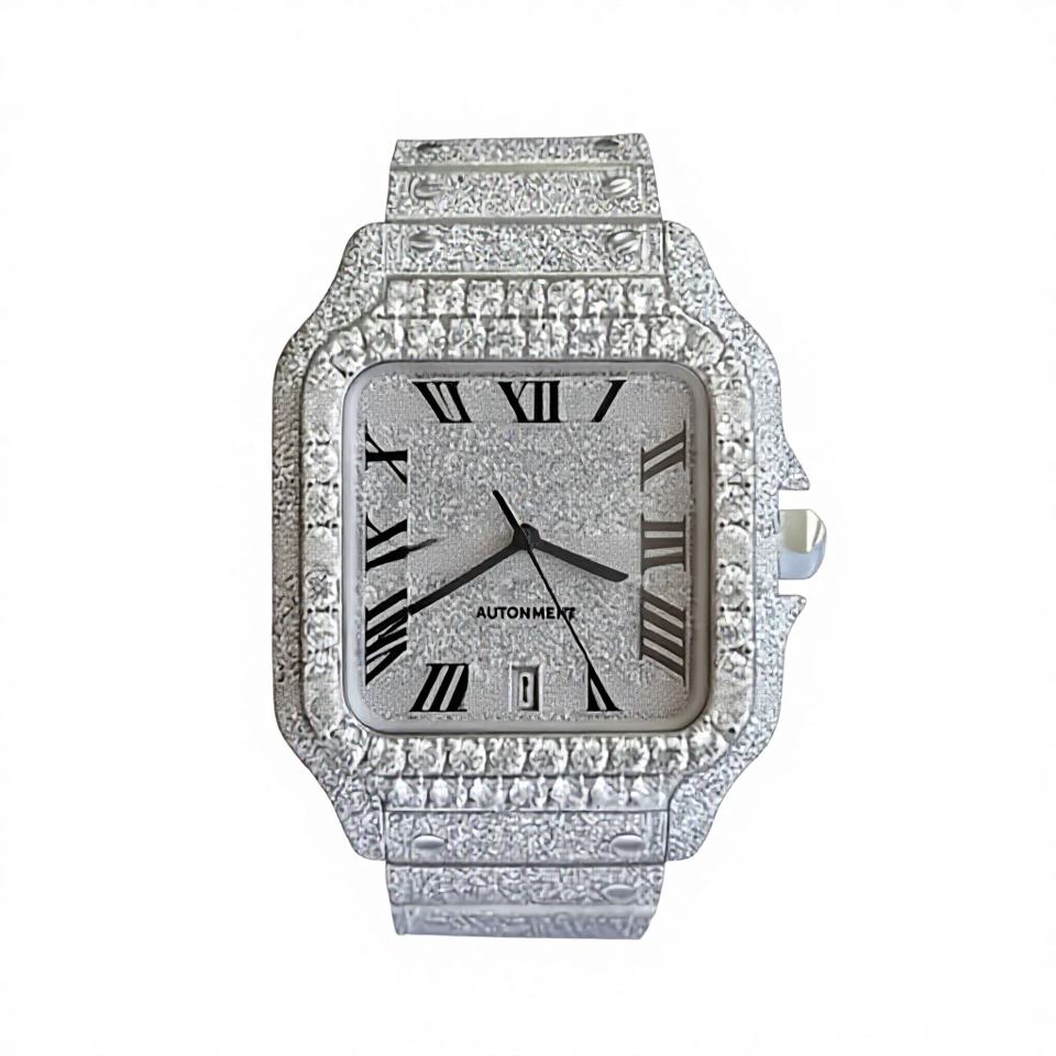Iced Out Square Glass Moissanite Watch with Stainless Steel Moissanite Automatic Movement 10 Bar Water Resistant Bracelet Clasp