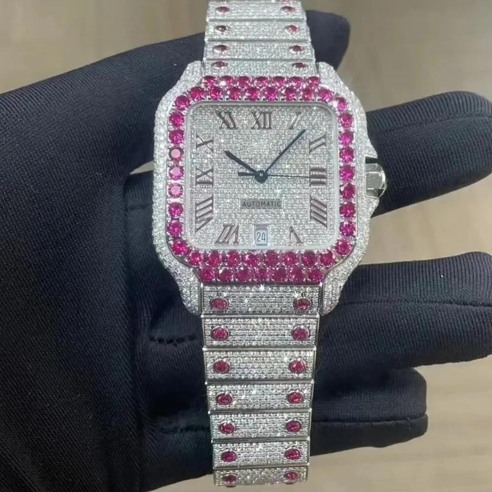 Iced Out Square Stainless Steel Luxury Automatic Watch with Pink Ruby Bezel Full Moissanite Diamond Dial Roman Numerals
