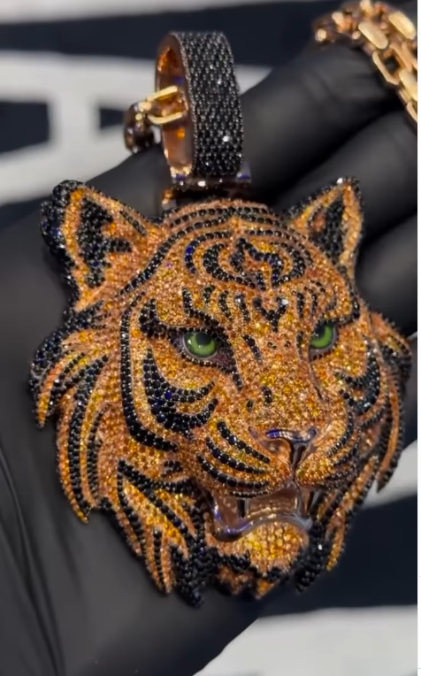 Iced Out Tiger Head Pendant for Men Gold Tone Moissanite Hip Hop Jewellery with Black and Orange Stones