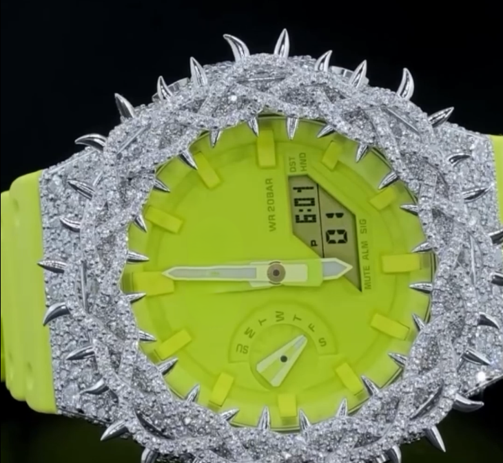 Iced Out VVS Moissanite Diamond Digital Watch Neon Yellow Band Luxury Hip Hop Mens T*mepi*ce Inspired Spike Bezel Custom Design