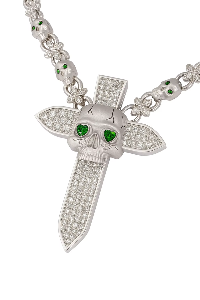 Iced Skull Sword Pendant Necklace Green Bezel Setting Moissanite Eyes 925 Sterling Silver for Men Hip Hop Gothic Luxury Fashion