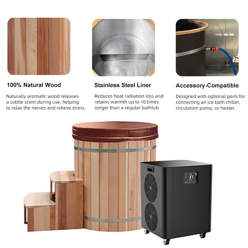 Icemend Luxury High Quality Cold Plunge Bathtubs 304SS Barrel with Heater and Cooler Ice Bath Chiller for Outdoor Recovery Spa