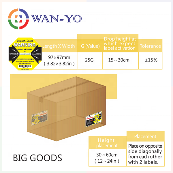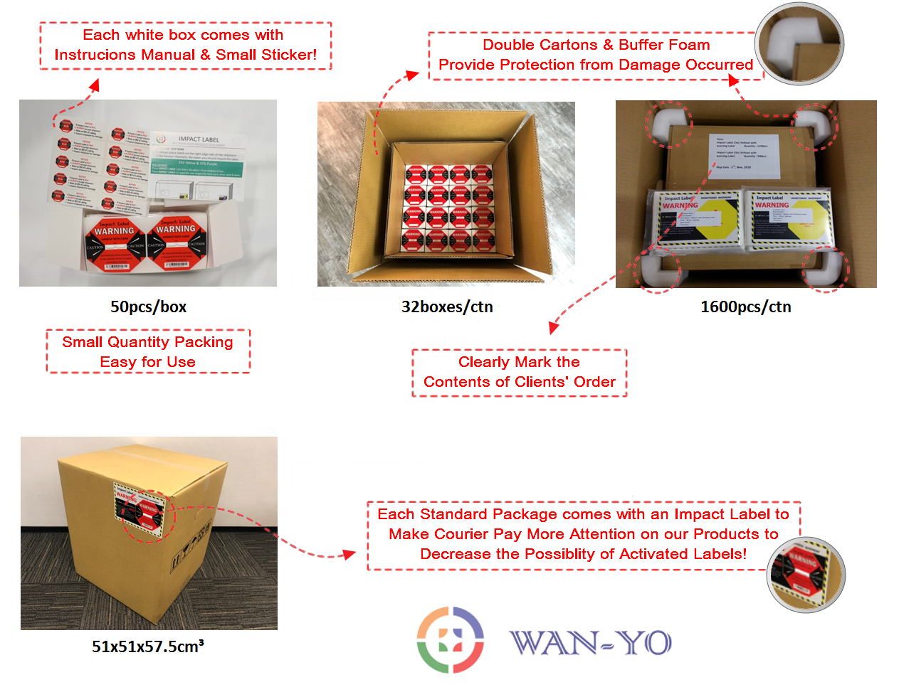 Impact Label : 50pcs/box | 32boxes/ctn | 1600pcs/ctn | 6400pcs/plywood case 1 inner carton + 1 outer carton to Assure Impact Labels Unactivated