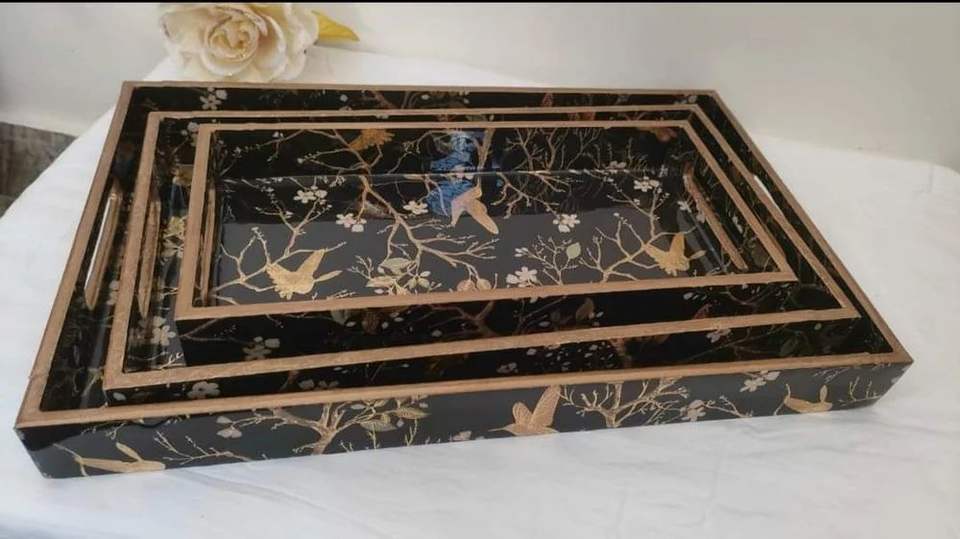 Imperial Luxury Handmade Wooden Enamel Printed Serving Tray Set with Radiant Gold Foil Finish for Elegant Home Entertaining