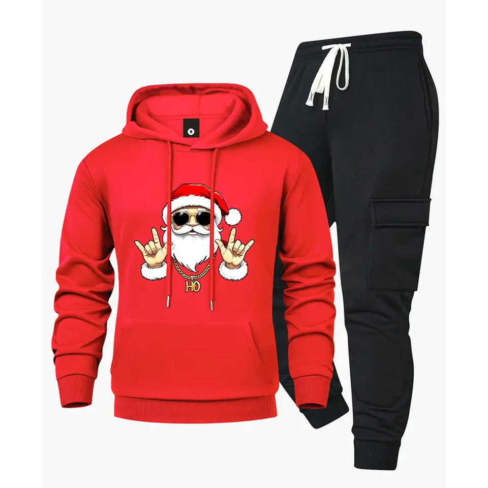In Black With Red Color Winter Fleece Jogger Outfit Fashion Christmas Tracksuit, Hoodie Pants Set Trendy Holiday Wear For Men