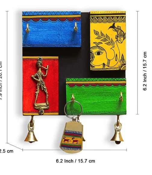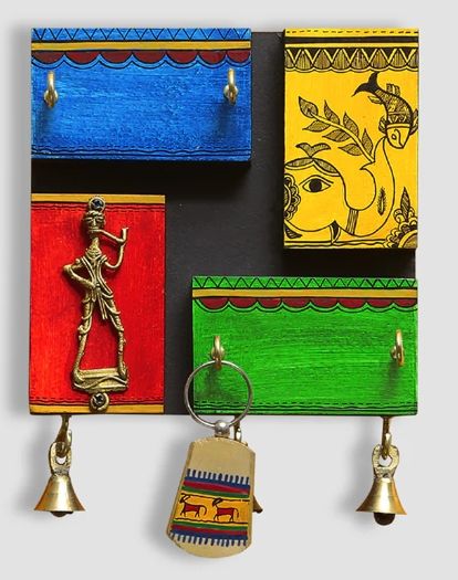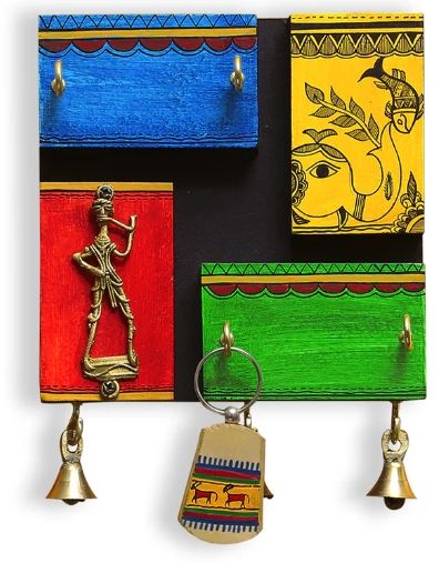 In-Key-Geneous Warli Hand-Painted Wooden Key Holder With Dhokra Art 4 Hooks Mounted Mail Holder for Home Wall Door Key Stand