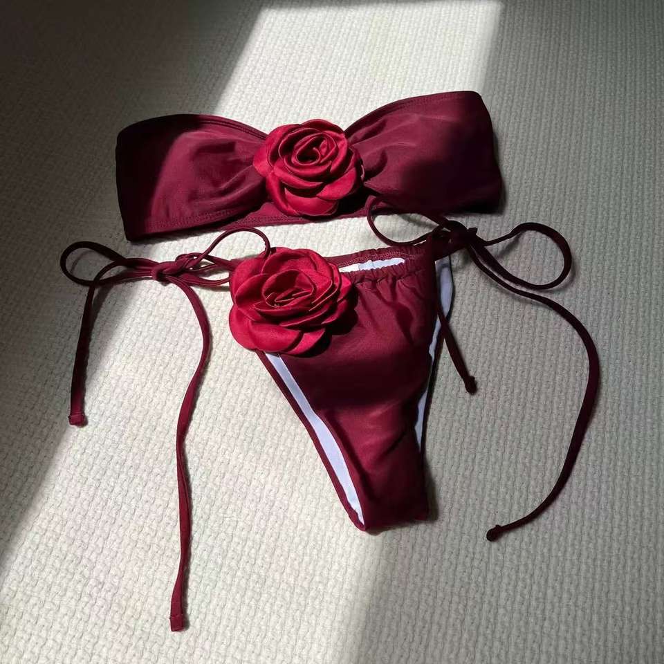 In-Stock 2-Piece One-Shoulder Bandeau Brazilian Bikini Set Leopard Plaid Patterns 3D Flower Decoration Chiffon Material
