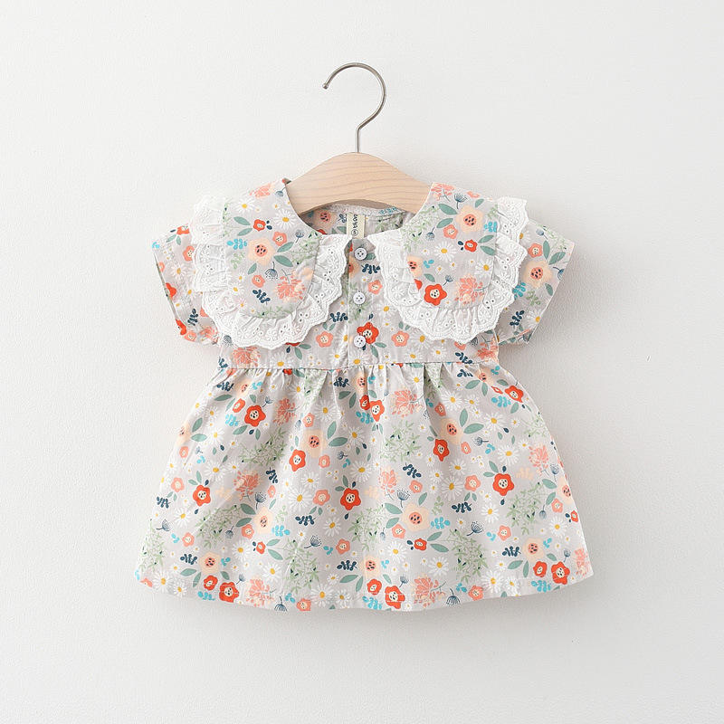 In Stock Children's Clothing Girls Short Sleeve Dress Summer Baby Floral Doll Collar Princess Dress