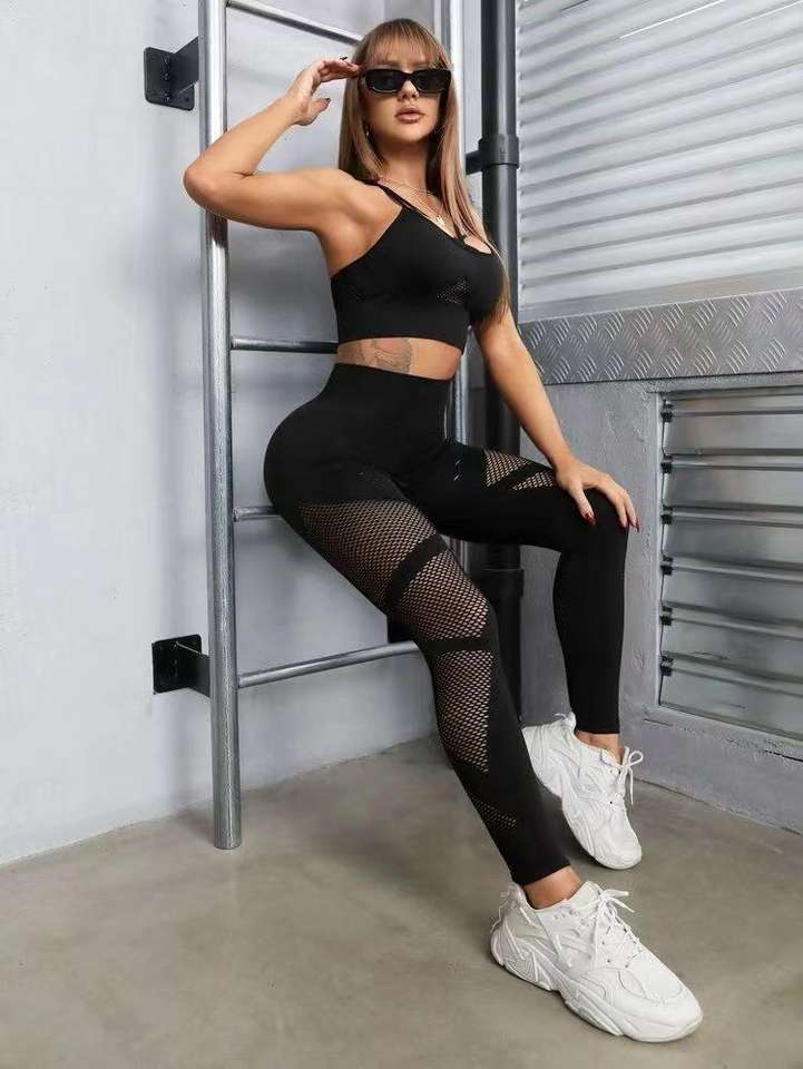 In Stock New Seamless Mesh Fitness 2 Pieces Yoga Suit Sets Sports Sexy Bra Hollow Out Leggings Set Ladies Gym Activewear