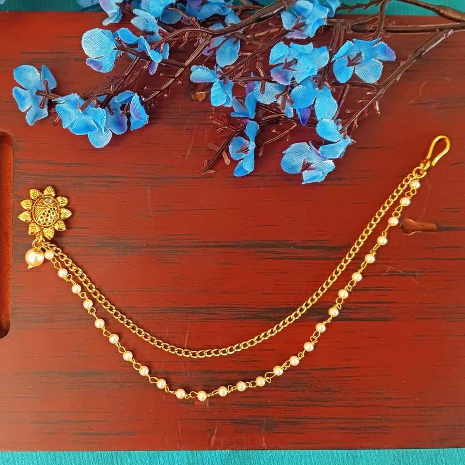 Indain Ethnic Jewelry Supplier Kundan Crystal Stud Wedding Nose Pin Faux Pearl Layered Head Chain Jewellery Set for Women