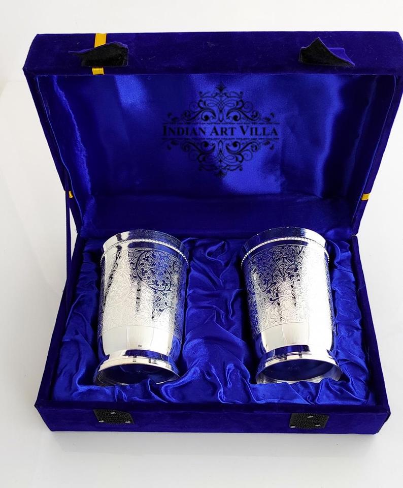India Art Villa Silver Plated Designer Glass Set of 2 with Blue Box, 260 ML-Tableware for Storage & Drinking