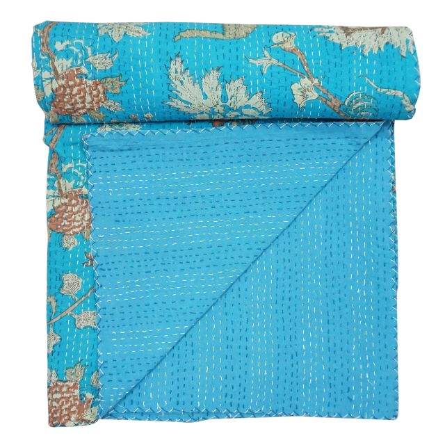 India Handmade Cotton Throw Bed Cover Washable Floral Block Printed Kantha Quilt Ethnic Gudri Throw for Hotel Use