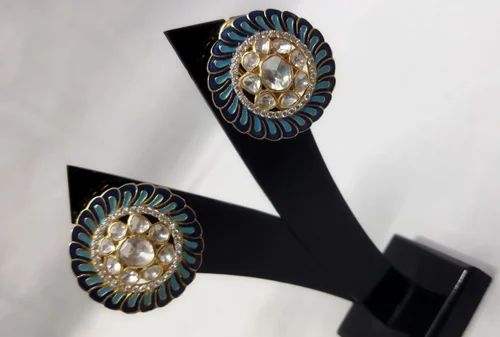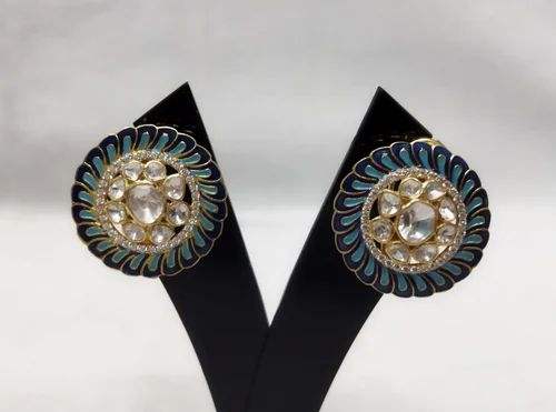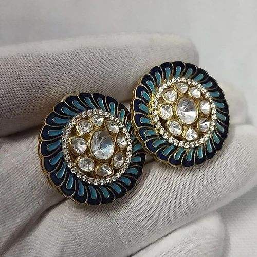 Indian Anti Tarnish 925 Sterling Silver Polki Floral Round Stud Earring For Women And Girls Blue Enamel Coating Luxury Appeal