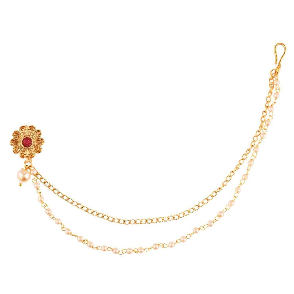 Indian Antique Jewelry Traditional Crystal Faux Pearl Stud Septum Nose Ring Hoop Pin With Layered Chain Jewellery, Red