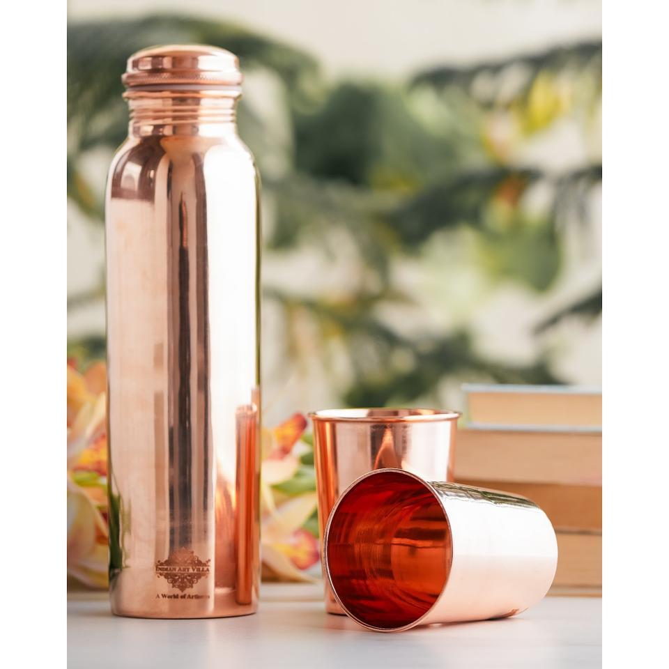 IndianArtVilla Pure Copper Plain Shine Finish Drinkware Set with Bottle & 2 Glasses in Pastel Yellow Box for Stroage & Drinking