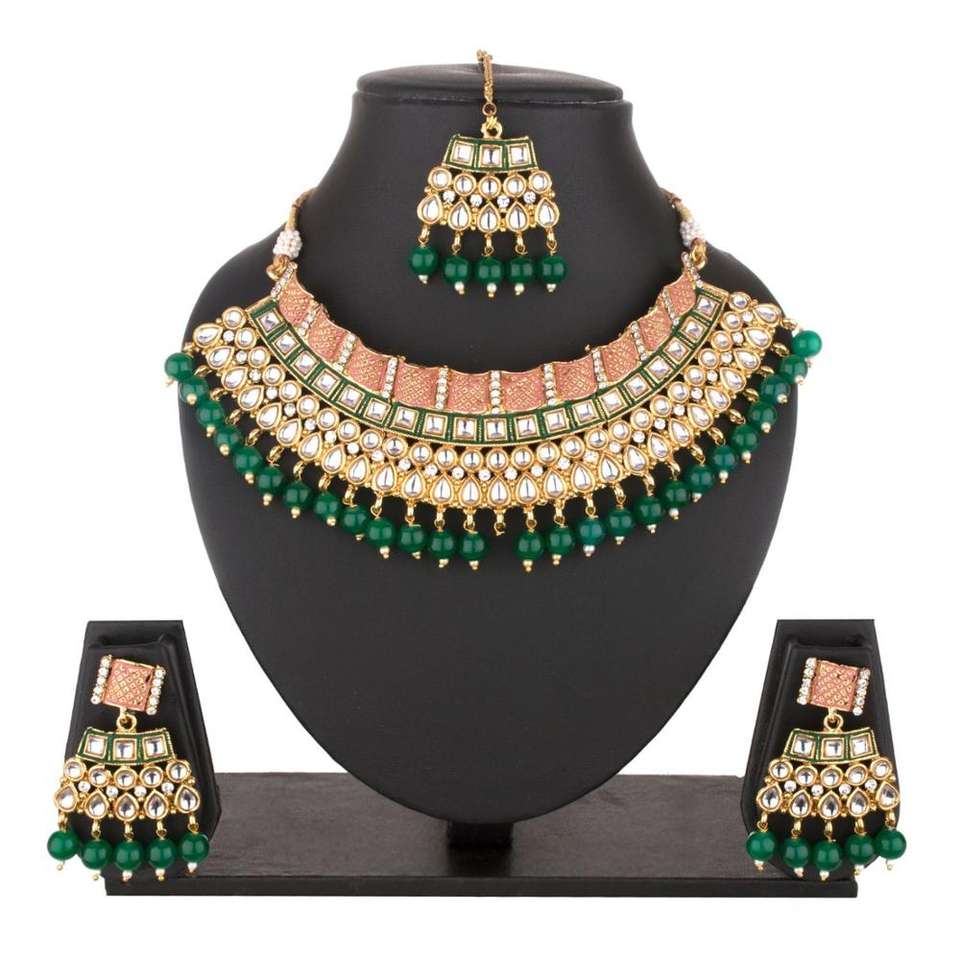 Indian Bollywood Crystal Kundan 14K Gold Plated Bridal Wedding Necklace Earring Maangtikka Choker Jewelry Set