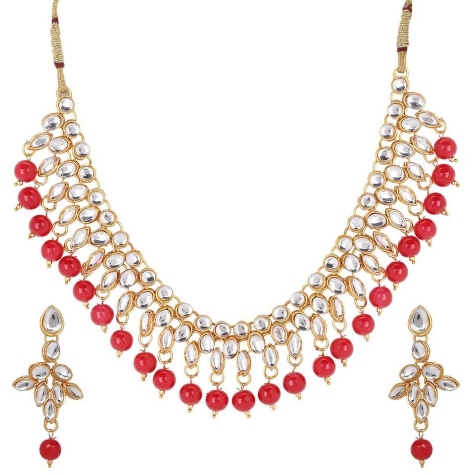 Indian Bollywood Gold Plated Crystal Kundan Rhinestone Pink Faux Pearl Wedding Choker Collar Necklace Earrings Jewelry set