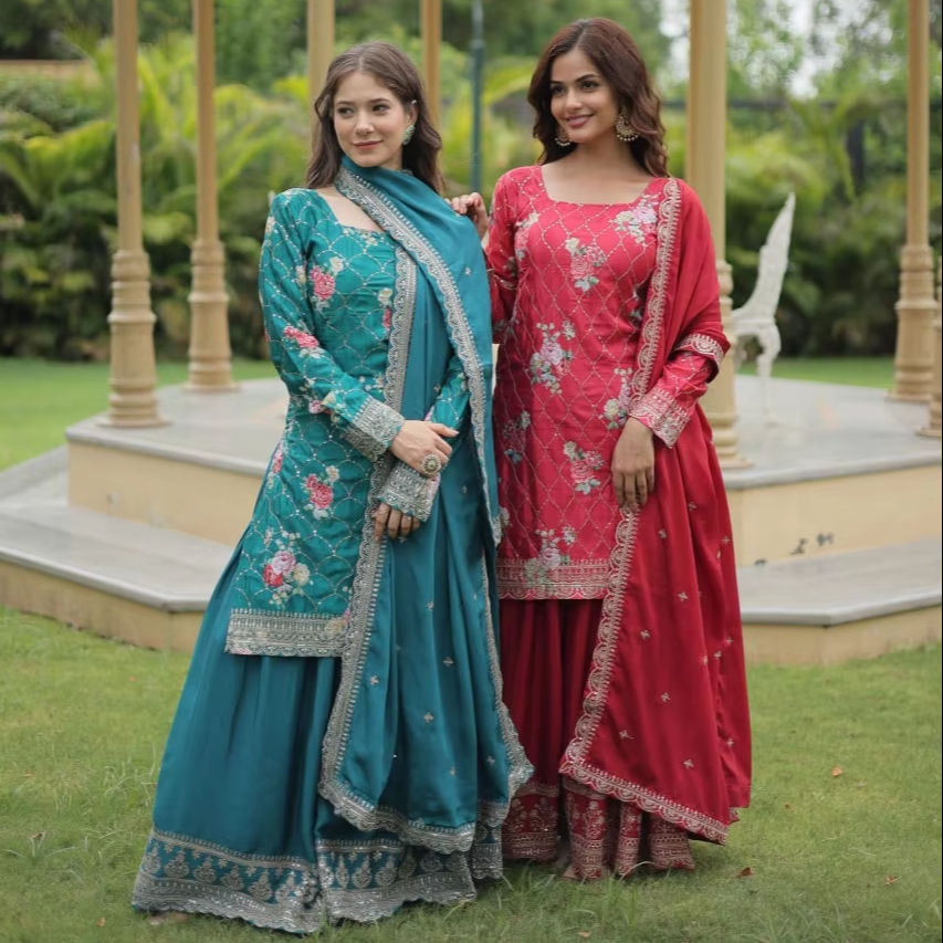 Indian Boutique Premium Quality Chinnon Printed Sequins Thread Embroidered Work Classy Elegant Latest Exclusive Washable Feature