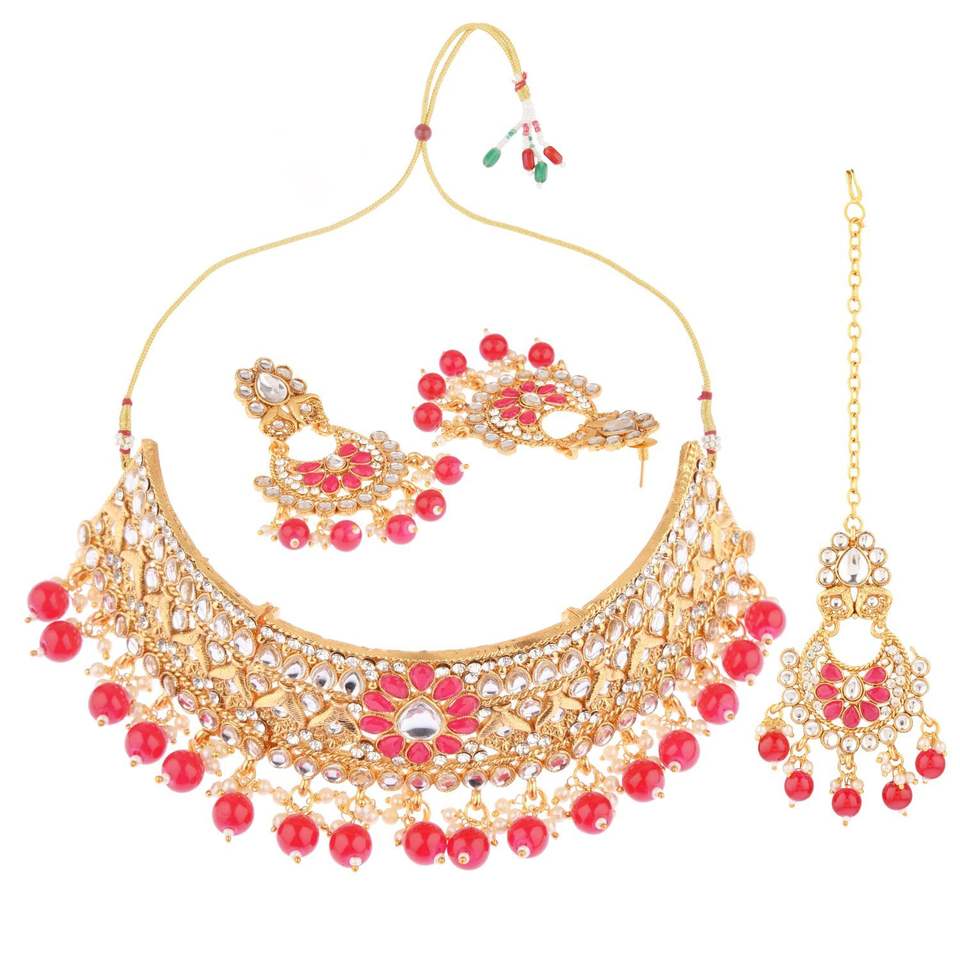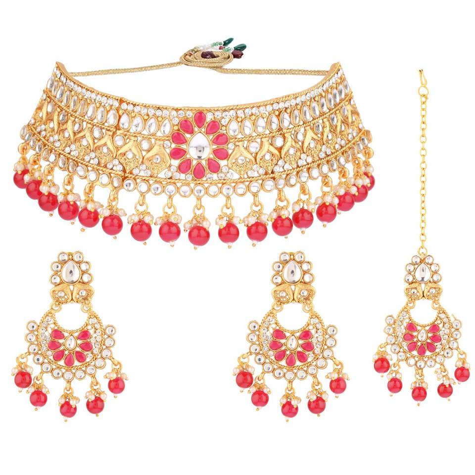 Indian Bridal Jewellery Faux Pearl Crystal Choker Necklace Chaandbali Earrings With Maang Tikka Jewellery Set for Women, Red