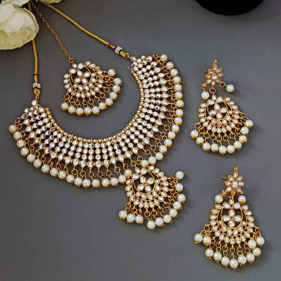 Indian Choker Jewelry Set Traditional Crystal Kundan Faux Pearl Bridal Necklace Jewellery Set For Women, White