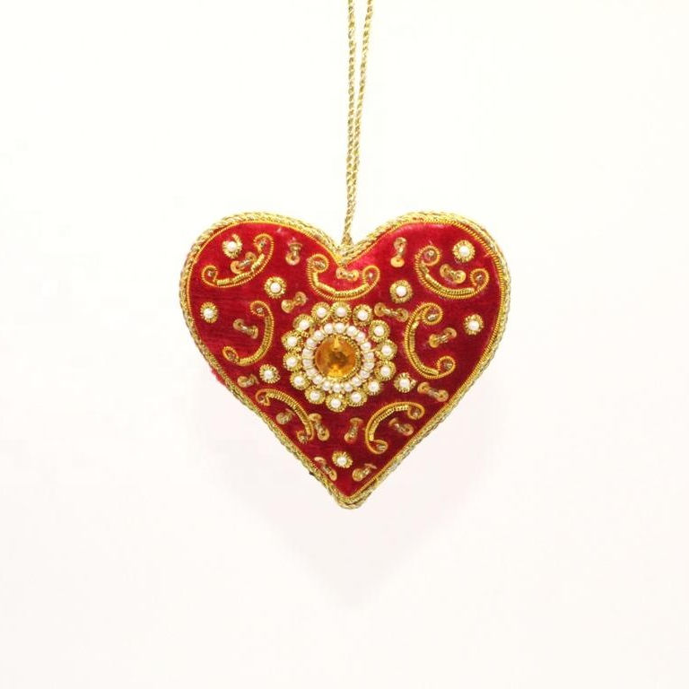 Indian Cloth with Glass Beads Embroidery X-Mas Heart Hanging Ornament for Indoor Christmas Tree Decorations